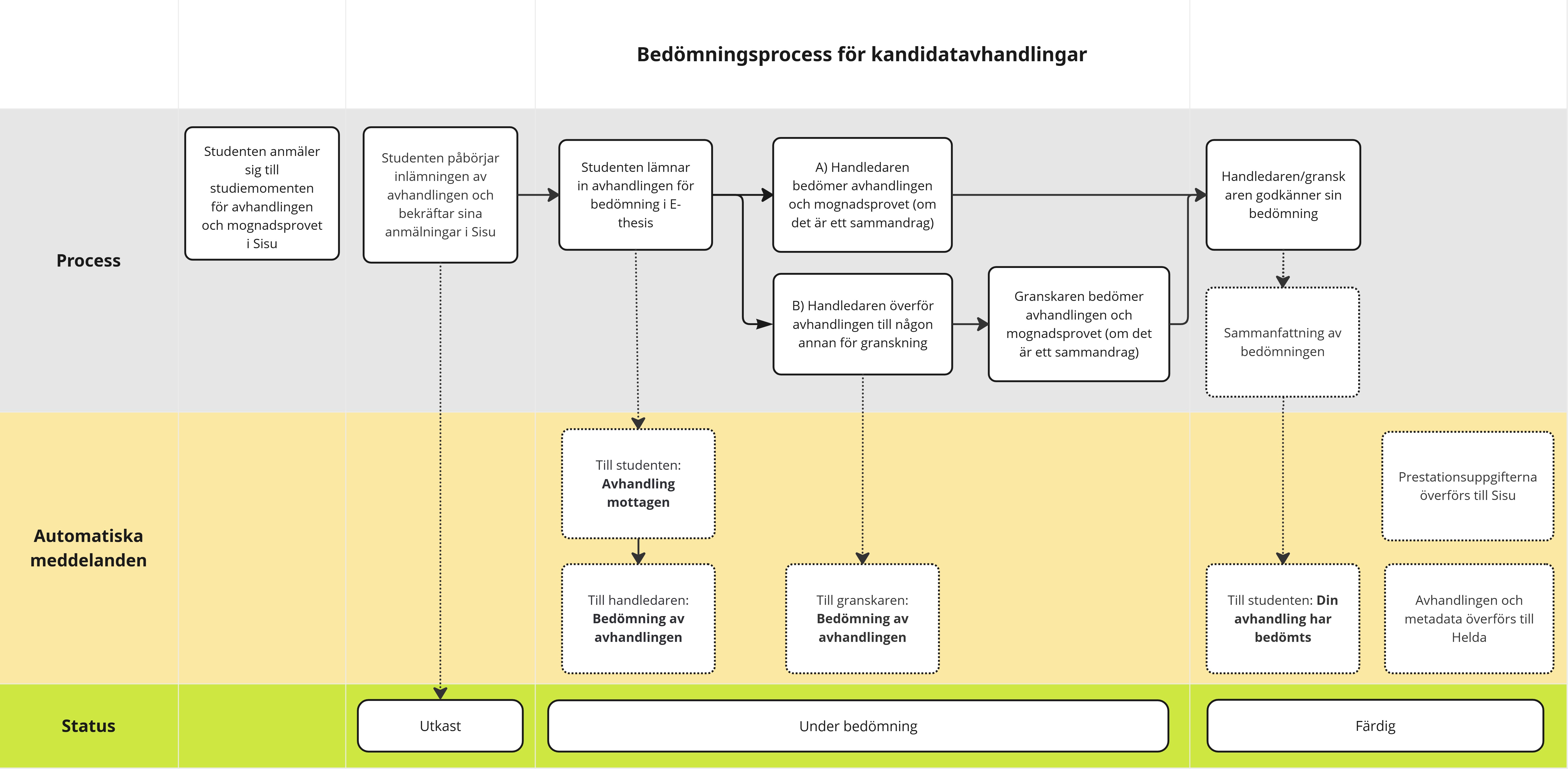Därefter överför E-thesis-personalen vid studentservicens serviceställe avhandlingen till fakultetsrådets följande möte för beslut om godkännande. Detta ska göras senast en vecka före mötet. Då får studenten ett automatiskt meddelande från systemet med bedömningsblanketten som pdf-bilaga. När bedömningen av avhandlingen har godkänts vid mötet registrerar studierådgivaren prestationen i studieförvaltningssystemet som en separat registrering och överför avhandlingen till E-thesis arkiv. Studenten får ett automatiskt meddelande om bedömningsbeslutet och tillståndet till elektronisk publicering.